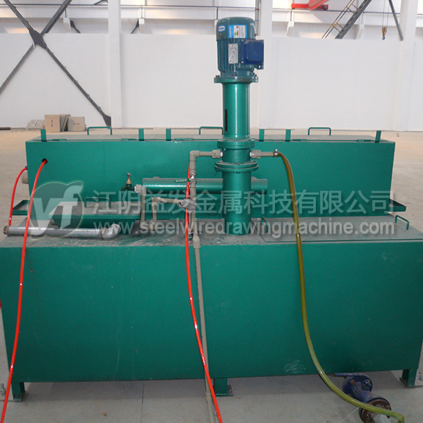 箱體采用Q235板焊接而成,內膽采用314不銹鋼板焊接防止硼砂水受銹蝕的污染,保持硼砂的純潔度,保持鋼絲涂硼效果。兩層之間有40mm的保溫棉。不銹鋼電加熱管12KW,有熱電偶控制溫度,1.5KW的提升泵用于硼砂水上下循環,相當于自動攪拌,箱體上層液體采用了多次溢流方式,出口處高壓氣吹用于調節鋼絲表面的硼砂量。長度2500MM,寬度500mm,高度1100mm,重量800Kg。